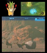 オーナーさ~ん♪ 私ももちろん持ってます~♪でも全然使ってません。この画像作るために出した位です(^_^;) でもこれ神殿に置くのGoodアイデア!!(・ω・)b だけど肝心のお供不在とは(≧∇≦) も~、1番最初に私泣いてた話してたのに。笑 >砂嵐は上空をホバー移動←えー!そんなこと出来たの~??私はちゃんとノーマルに飛んで行きましたよぉ。 握手会は私、高い場所に避難して時が過ぎるの待ってから落し物拾ってました。 オーナーさんは積極的に握手会ツアー参加してるんですね。それは凄い!多分私はチャレンジ不要なら戦わない(笑) マスターソード、ゲットしてから次男坊がネタバレ教えてくれました。何だかゲットするのに3パターンあるそうです。全部のパターン聞きました。オーナーさんは結構早い時期でしたよね。コスリンクはどれになるんでしょうね♪楽しみですよね(*^^*)♡ 因みに私は1番大変なパターンでした(笑) 知ってたら避けのに~(ToT) トホホ。 どおりでね、話おかしいな。て思ってたんですよ。全部見たら…って聞いてたのに(全部見たのはだいぶ前です) 1番時間かかったパターンだと思います。 画像の下の絵は鹿撮ろうとしたらバグって後ろ足が岩に刺さったまんま…。ある意味貴重?面白画像ということで(^^ゞ