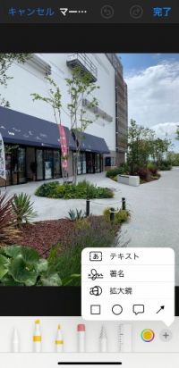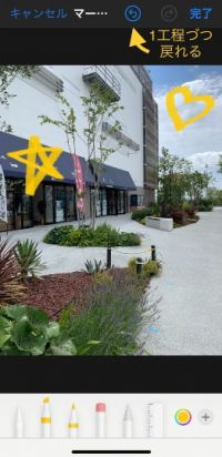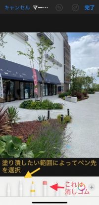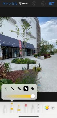 iPhoneに元々入っているアプリ『写真』を使って、塗り潰しなどを行う方法、その④ 『マークアップ』をタップすると、このように画面下部に筆記用具等が示されます。 筆記用具によって塗りつぶしできる太さや質感が違うので、試してみると良いと思いますが、私は左から二番目の『マーカー』を主に使っています。 使いたいペン先を選んでタップすると、選択した筆記だけ少し上にアップしたような画面になります。 #画像編集 #iPhone 塗りつぶし