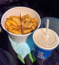 あとこれも。フードコートで食べるの、ちょっと心配だったので車の中で食べたよ。 旦那と2人でホットドック食べながら少し食べて、お家に着いてから残りを2人で食べたんだけど完食。 ジジイ&BBAだけど・・・ペロっと食べちゃった(^_^;