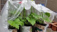 5/5に植えたズッキーニ。19日目 先週、梅雨入りしそうとか大雨とかの情報を頂きありがとうございました。日陰&ジメジメ対策に、考えて考えて無い知恵を絞り、簡単なビニールハウスを作ってみましたよ。心配かけてばかりでごめんなさい。温かいお気持ちに答えるには、大きくするのみ! 100円ショップの朝顔用の柱?を立てて、大きなごみ袋を開いてかけました。 土が乾いたら少し開けて雨を入れて、基本は、ざっくりかけてるので、空気や風は通ってるはず。 写真は、雨がやんでるので開けてます。 とても大きくなりました└( ゚∀゚)┘└(゚∀゚ )┘ コメント打つときの横の字数とアップされた時の字数が異なるので、句読点ミスるときありますね。 打ったときは、はしっこにきていて読みやすく、句読点要らないなぁ と思っていても、アップされたら読みにくいなぁーと反省すること多々あります。 普段使う言葉より優しく語りかけるようにしていますが、誤字脱字多いし、いつもヘンテコでごめんなさいf(^^;