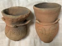 4000年前築の古民家で思い出しました! 長野の尖石(とがりいし)遺跡の博物館で作った『縄文風土器』です。 背の低い方が息子、右が私作です( ̄∇ ̄) 使い道があったらどうぞ(^^) #画像 #縄文風土器