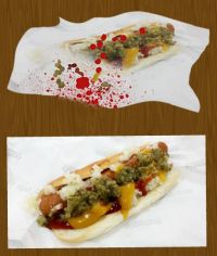 そのホットドッグこそが、生き物トピで「手元の段階で潰れて」の代物です。 元画像(添付下) が既にハッキリした画像ではない上に『食いかけ』に加工したのと、四角くトリミングしてある包み紙を『ゆがみペン』で変形させた事で潰れを助長したようです。 テーブルが白いから、包み紙の『外側ふちどり』した方が銀紙っぽくて目立ったかなぁ? その場合、もう少し丁寧に包み紙を変形させないとアカンわね。 #画像 #コストコホットドッグ