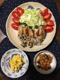 神奈ちゃん 生姜焼きから変更 豚肉の紫蘇チーズ巻き カボチャサラダ、大豆煮豆 のほほんちゃん料理トピでは無く 紫蘇の使いみちです。