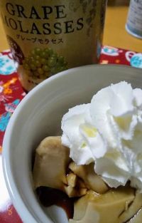 卵オーナーさんに教えて頂いた業スーのグレープモラセスで、コーネン対策?の豆乳プリンを作ってみました。 【材料】 豆乳 300ml 粉ゼラチン 5g グレープモラセス 大さじ2 水 大さじ2 グレープモラセスと水を混ぜ合わせたところへ粉ゼラチンを振り入れふやかす。 レンジに600W30秒かけ粉ゼラチンを溶かす。 豆乳を50度ほどに温めたら火を止め、上記の溶かした粉ゼラチンを入れて混ぜる。 型に流し入れ粗熱を取って冷やし固める。 淡い甘さなので、食べる時にお好みで適宜グレープモラセス(分量外)を掛けます。 卵オーナーさん、グレープモラセスのご教示ありがとうございました_(..)_。