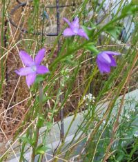 後ろの他の草にピントが合ってしまったけど、ここ3年くらい生えるようになった多分キキョウソウです。もしかしたらヒナキキョウソウかも。ヒナかどうかの見分け方が分かりません。 渺渺さんご紹介のGoogle機能で調べたらシランが出てきちゃった…多分ピンぼけのせいです(笑) ちなみに、ヒナキキョウソウとヒナギキョウは名前は似てるし同じキキョウ科だけど属は違うし見た目も違うし原産地も違うそうです。 ヒナキキョウソウ、キキョウソウは外来種一年草。 後ろの荒れ果てた庭は無視してください。