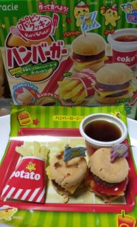 師匠〜♡ お疲れさまでした〜(◕ᴗ◕✿) 今日、うちの小学生のおやつに知育菓子でこれを作って食べました♫ ちゃんと、ハンバーガー、ポテト、コーラの味がしたそうです。 私は怖くて味見もしていません(-_-;) アマビエ様が次は作ってくれるかな??(笑)