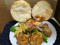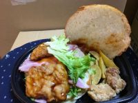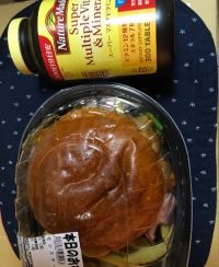 ロピアモンスターバーガー 鳥唐揚げ2 タツタ揚げ2 ベーコン2 プロセスチーズ スクランブルエッグ フライドポテトバンズ直径15 高さ7センチ 笑ってやってください。540円です。