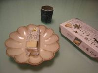 「三方六 濃い白 小割」です。 トッピングのざらめがシャリっとしています。 ちょっと和のテイストにしてみようかなと思い、飲み物は蛸唐草のカジュアル目の湯呑みに献上加賀棒茶を淹れてみました。