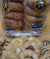 夫婦2人の週末のブランチにしては量が多過ぎてなかなか手が出せなかった新人隊員殿(私も殿って呼びたい♪)オススメのベーグル、週末に娘が来るというのでやっと買いました! チーズとハニー♪ ちょっとだけ千切って食べてみたら、噛む毎に甘さが広がりますね(^^) ブランチ楽しみ~♪ しかもね、見えるでしょ? デニッシュ。。(^^; だってさ、もう夕方なのに、200円クーポンも出てるのに、たーくさん残ってたんですの。。 つい、買ってしまった(^^; 私のコレステロール値、どうなるのぉーーーっ\(>_<)/ジゴウジトク