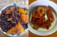 左。冬至かぼちゃです。手抜き、切ったかぼちゃを茹で、水切り、缶詰小豆を鍋に、かぼちゃを入れたら混ぜて温まったら出来上がり。 一切れを仏壇に。 右。以前作ってたフライドポテト、レンチンしてケチャップを掛け、かぼちゃ待ちの間に合わせ用。フライドポテトはこれが最後。