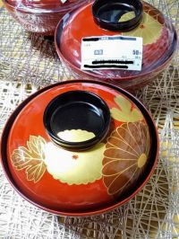 器のトピの方がよいかもしれないけど、せっかくJINJINにご来店だからこちらで。 蓋つき椀はこんなイメージ? これさ、コロナ禍制限が一番厳しかったちょい後くらいに、全国チェーンのリサイクルショップを覗いたらひと椀50円でバラ売りしていたのよ! 新古品というのかな、未使用だった。引き出物か内祝品だったのかな。 説明書等何もないので、木の塗り椀なのかプラ系ポリ系なのか、何塗りかも何もわからん、けれどわたしも蓋つき椀が欲しいと思っていたので残っていた三客をお買い上げしました。と言っても計165円税込。模様は蓋のみ。 今思うとコロナ禍の自宅待機で断捨離された方が多かったのでしょうね。お宝的なものが(食器類)今よりはたくさん並んでいた気がします。ロイヤルコペンハーゲンのイヤープレートなど1990年代半ば~2001年のものがやけに多くて、その頃ご結婚のお祝いに頂いたパターンなのかなと。