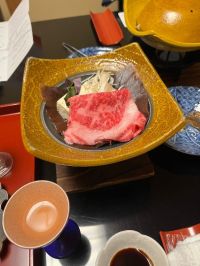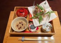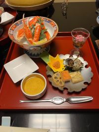 和倉温泉加賀屋姉妹館「あえの風」の夕食です。喜んで下さいスナックJIN JINで話題になった梅水晶が付いてましたよ!黄色の紅葉の器がそれです。さっぱりとした梅の風味にコリコリとした鮫の軟骨がなんとも心地よく呑んべいには堪らない酒の肴だと思いました。ここでもナマコ酢(ガラス)が再び…勿論食べられない義母は義父に押し付けてました。わたしにちょうだい!さざえの下の黄色い寒天寄せは「恵比寿」と言って能登では祭りや祝いごとに欠かせない行事食。砂糖と醤油が味付けのベースになる為べっこう色の見た目になります。