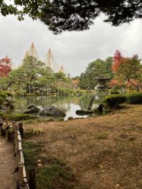 曇天の兼六園の雪吊りです。雪の重みで枝が折れないよう縄で補強する方法で支柱(芯柱)を立てて円錐形に縄を張るりんご吊りが最も有名。