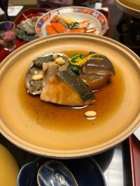 煮物です。あわび大船煮、鰤大根田舎煮、ジャンボ椎茸 大船煮(だいせんに) 鮑を大豆と一緒に柔らかく煮込んだ料理。鮑を船にグツグツと煮える大豆の様を波に見立てたという説、大船がゆっくり前に進むようにじっくりと時間をかけて煮あげることに由来する。 上記の通り鮑はぶりんぶりんに柔らかく極厚椎茸は程よい甘味と歯触りで美味しくまたしみしみ大根が美味しくて大根だけおかわりしたい気分でした。 吸い物のふぐの白子豆腐とお造り盛り合わせは写真撮り忘れました。ぐすんぐすん