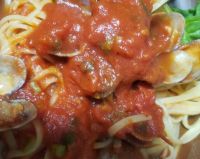 オーナー\(^o^)/ アサリの酒蒸し、トマト缶でパスタ作ってみたよ~!遅めのお昼だけどランチしませんか? 残り物で作ったけど~m(_ _)m酒蒸しのだし汁アレンジ♡