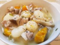 ラグビーの再放送22時から、楽しみ♡ 今夜はお月見。広島では白味噌でつくるだんご汁を食べるということで、作ってみた(ФωФ)