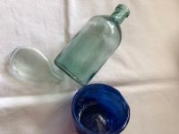 こちらは古い瓶です。 濃い青のはもはやお皿でしょうか。 左のは、昔の目薬の瓶のようです。 気泡の入った透明や青緑色の瓶が 好きで蒐集しています(о´∀`о)
