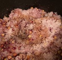 アントシアニンなのかしらね、ご飯にちゃんと色がついてます、いただきま~す♪。 ( ‘༥’ )ŧ‹”ŧ‹”。 今夜はうちもレトルトで炊飯するコーン入りメキシカンライスでした。ジャンバラヤみたいなの。
