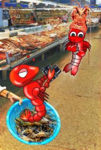 別トピからネタぱくり♪ 【撮影会@魚市場】 ★見栄張って、伊勢海老の被り物をするアマエビ ★手足いっぱい持ってるクセに、忙しい店員サンの手を煩わせてザルに乗るザリガニ(ザルガニ? ザルエビ?) #画像 #魚市場 #あまえび #ザリガニくん♪ #エビ強化月間