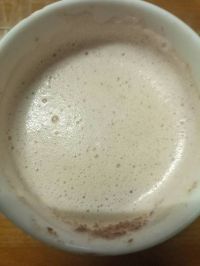 ん〜、実物はもうちっと赤みが強く食欲を失う程ではないです。ビーツのポタージュモドキです。 分量:ビーツ 47g(一玉)、牛乳 140cc、ニンニク ほんの少し、コンソメ顆粒 ひとつまみ。 ビーツと牛乳の消費、目先変えで作ってみました。マグカップにビーツと牛乳を入れてハンドブレンダーで粉砕。漉す等の裏ワザを使えばトロリとするのでしょうが一人分なので手抜き(苦笑)。30秒ほど回して細かくなったら終り。ニンニクを足してレンチン1分40秒、コンソメ顆粒を加えて味見し量を調節。入れ過ぎはご法度。 マグカップはハンドブレンダーが底まで入れれるのを選択したほうが良いでしょう。分量と回し方を間違えると飛びます。おかずにも注意をはらう必要が有るでしょう。 味は好みが出ます。サラダで生食(加熱済みですが)出来るなら大丈夫? ビーツの賞味期限が残りひと月、挑戦しました。