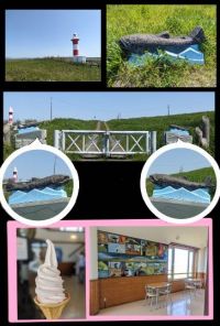 まず1番最初に行ったのが、石狩灯台でした。 コストコ石狩倉庫からだと10km位の距離になります。駐車場に車を停めて1番最初に目に入ったのが、右上の草むらの中にあった鮭のオブジェ? 真ん中のは帰る時に気付いたのですが、堤防へ上がる道が閉鎖されてて、ふと気付くと鮭(≧▽≦) しかも左右に。わかりますかね? あとここ、はまなすの丘公園には休憩出来る施設がありました。お土産もちょっと売ってました。 左下のソフトクリームは「はまなすソフトクリーム」です。画像では分かりづらいかもですが、うっすらピンク色のソフトクリームになります。 観光客もまばらですが来てました。多分全国的にはメジャーではない場所のような気がしますが、のんびりムードで人嫌いの私には丁度良かったです。 そうそう、石狩市の海水浴場に近い場所にあります。