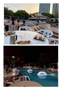 ビアガーデン、プールがあってキレイですね!肘が置ける椅子がいいです♪