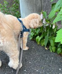 久々の地面の感触とクン活でしたから、嬉しかったとは思いますよ。 ただ物足りないとは思っているよう、今朝の散歩では家の前で座り込みをして帰宅を拒否されました(^^;) 本犬はヤル気満々のようですが、万が一があるのでボチボチ増やしていく予定です。 画像は昨日のものですが、ホタルブクロの匂いを嗅いでいましたよ。 #画像 #ラン #クン活中