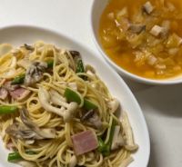 いらっしゃいませ~♪ パスタにスープ。完璧。 いただきま~す♡ きのこはガーリック風味で肉類と炒めるか、炊き込みご飯にします。鍋もいいな。