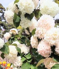 葉脈の凹凸の特徴、少しピンクがかった球がある、構図から推定した樹高などから、オオデマリのピンク系の園芸品種だと思います。