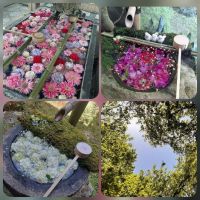 わぁ、花手水だぁ、スバラ式♡ お空も青い。 今日は昨日とうってかわって気温が下がっているとニュースで言ってましたが、そちらは冷んやりですか? 上着等でうまく調節して下さいね♡
