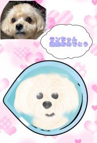 ランちゃん。 (もうちょっとで)退院おめでとう! 隣のおばちゃんは、相変わらず似顔絵下手っぴでごめんなさい_(┐「ε:)_ でも愛情はいっぱいだからね〜♡♡♡ 風船ガム(新素材)に入れたから、ちょっと膨らんだランちゃんになちゃったよ〜←という事にしといてね(笑)