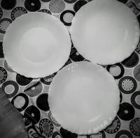 実家にあったヤマザキの白いお皿。おそらく80年代~90年年代のもの。縁のフリルの形と底面の径が各々微妙に違っております。30年近く使っているとお皿の表面が傷だらけ。フリルの違いを見せたくてあえてモノクロームにしてみます。上2枚が古いお皿、下が2023年のお皿。