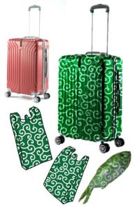 唐草模様のスーツケースが実際に市販されているか?など、全く頭にありませんでした。 スーツケースの画像(左上)に、オーナーも使われていらっしゃるであろうibis唐草模様素材を貼り付けただけでぇ~っす(´>∀<`)ゝテヘッ ついでに『ボツ』にしたレジ袋と、今思いついた『唐草キンメ』も載せておきます♪ #画像 #素材 #唐草模様
