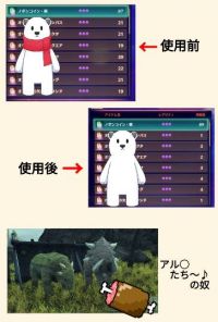 例の欠片たち。使用前と使用後です。 正直、強化された実感あまりありませんが、集めて思ったのは、必要量以上に多く存在してたことです。手っ取り早いのはユニモンでした。←(個人の感想ですが(^^ゞ) フィールドにも結構あるので、普通にプレイしても集まると思いました。 あと、アル〇たち~♪は、「ゼノブレイド3 動物 育成」でヒットするはず。私はこれ、終わらないかと思った~(;_;) 途中かなり焦りました笑 ※以前、ぼやかし過ぎて分からなかったかと思い、書きました。 あと、自力では絶対見つからないクエスト、個人的には「味噌」のクエストだと思いました。(もちろんクリアしましたけど(^-^)) これは絶対自力では無理。実は朝方までプレイしてて、ガデンシア地方の海のマップ埋めしてました(^^ゞ なので少々眠い。