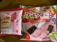 あまえびちゃん♡ イチゴ味のもの、買ってきました〜♪ お菓子売り場もパン売り場も、イチゴ味のものが色々並んでますね(^^)