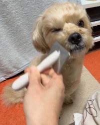 ドライヤーを嫌がるワンコ、 渺渺サマの仰る様に、音が嫌いな子 風が嫌いな子 背中に当たる風はOKだけど、顔は勘弁な子 犬それぞれですよね。 目の周辺の毛をカットする際、ワンコは本能的?に目を瞑るから、どのワンコも恐怖は多少なりとも感じている筈で、 コームだと、トリミングでも目脂取りでも使うから体験数が多いし、形状からもスリッカーより迫って来る恐怖心が薄れるかなぁと思いまして。