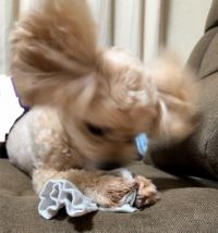 ビリ子ちゃんのお耳に対抗して? 靴下を齧りながら頭をブンブン振ったらこんなのが撮れました(笑) #画像 #ラン 靴下は渡さないンダ