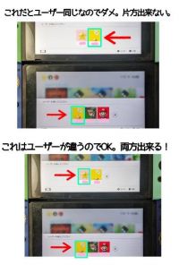 オーナーさーん! 寝ようと思ったけど、実験して成功!! あのね、ユーザー別でプレイしたら両方ダウンロード版でも遊べるよ! 出来たの!!ヽ(*^^*)ノ さっきまで両方のSwitchで同じユーザー名使ったからダメだったのね。 両方アカウント一緒なのを逆手にとる訳じゃあないけど、利点と考えて、旦那さんのSwitchにもオーナーさん購入したダウンロード版、全部再ダウンロードとして入れれるはず。 で、ユーザー名、別にすれば、それぞれのユーザー名でなら遊べるよー! 試しに画像上のSwitchではユーザー名エポナで、下のSwitchではユーザー名馬でなら遊べた! 言ってる事わかってもらえたら良いんだけど…。 任天堂とか調べても同時に出来ないのは同じユーザーだから。別に登録したら出来るから試してみてくださいな。これで上手く行けばオーナーさんも旦那さんも同時に気兼ねなく遊べるね! 証拠写真だよー。どっちもダウンロード版だよ(^^) よく分からなかったら、Switch①とSwitch②両方にオーナーさんと旦那さんのユーザー名登録して、 Switch①はオーナーさん名で。Switch②は旦那さん名で。遊んだらわかるよー! 試しにやってみてね~♡ (^^)/ ※コス子さま、夜中に何度もすみませんでした m(_ _)m