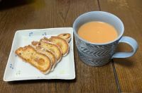 オヤツの時間なのでシュトーレンとミルクティーはいかがですか? シュトーレンは今年初めて購入した焼き菓子のお店のものですが、オレンジコンフィ入りのマジパンが入っていて、良い香りですよ〜。 #画像 #ミルクティー #シュトーレン