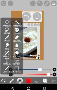 タブレットとスマホでは、ツールバーのディスプレイが違ったりしますよね~。 先程は下部をトリミングしたスクショを送りましたが、今回は全貌が解るヤツ。 過去に使っていたタブレットは充電するところから始めるから省略させて頂いて、 記憶を辿ると、もしかしたら↩️の位置も違ったかも? 添付画像、下のバーの機能は左から ①消しゴムとブラシの切り替え ②【移動変形】→【】キャンバスのバーを表示させるボタン ③今使えるブラシの種類が表示されます。 ④同じく、使える色が表示されます。 ⑤このバーの色をグレー/透明の切り替えボタン ⑥レイヤー番号 ②作業終了ボタン タブレットの時も、どこかを触ると勝手に戻ってしまう事があり、『設定』の問題かも? だとすれば、オーナーが詳しい?