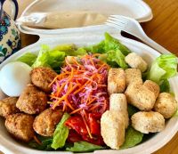 急に思い立ちランチにコストコのファラフェルサラダ購入! (コストコは弁当屋ちゃうけどぉ〜) ファラフェルちゃんお初にこんにちは。 う、旨い! ヾ(@^▽^@)ノ チーママ3連チャンに納得、美味でございました。 彩の良さ、ボリューム、ドレッシングの味(量チョット多め)総合的に女子ランチにドンピシャだと思いました。 半分食べ進んだ頃、冷凍庫のピタパンの存在思い出して、あぁ〜詰めて食べればよかったと後悔。 2連チャンの折にはピタパン君に優しく包まれたファラフェルちゃんで頂きたいと思います。 チーママ、もしかして4連チャンしてる?