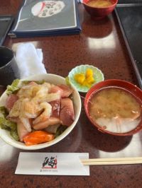 写真はモサエビの乗った『鳴り石丼』です。パワースポット鳴り石の浜から名前をとった様で海鮮を絡めているタレが美味しくて箸が止まらなくなりました。ボリュームと値段とも満足出来る一品です。海なし県に帰る前にいっぱい海鮮を食べるんだぁ〜♪