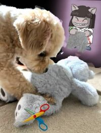コットンのお気に入りバーガー(直径6cm程)です。 …というか、他の物を与えていないとも言いますね(笑) これとセットでポテトとホットドッグも付いているので、内容的にはコストコとほぼ同じです。 コットンも食いちぎり系なのでぬいぐるみは与えられてもすぐに回収されます。 ランちゃんはまだヘラ鹿さんが無事なんですね。 去年触ってみてアウトだと思ったのですが、やはり、コストコトイは丈夫ですね。