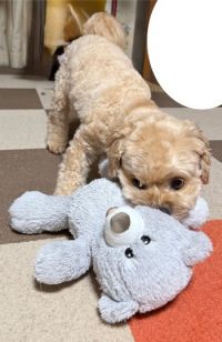 この間のお誕生日の写真よりデカいですね〜多分ミニチュアプードルかと思います。背中の丸い物は何でしょう?周りの毛が残してあるのも気になりますがちょっと分かりません。ただヤンズーはノーメイクに近くとも素晴しく可愛いと言う事はわかりました♪ 眼福♡