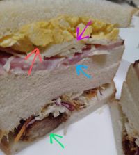 キッチンの斬鉄剣orプログレッシブナイフ(笑)のサンドイッチ切れ味。 オレンジ;スクランブルエッグのマヨネーズ和え 紫;スライスオニオン 水色;スパイラルハム 緑;トンカツ(置き場所ズレちゃったぃ) 食パンもサンドイッチの厚さにカットしてます。 スクランブルエッグの断面なんて、アルんだ...オニオンなんて横向き...普通の包丁なら刃に引き摺られてズレてグチャるポイントじゃん?(・д・)ヘー
