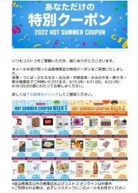 今日、郵便で届いていました。 前橋、つくば、ひたちなか、北九州、中部空港、かみのやま、野々市、射水倉庫限定のクーポンのようです。 割引を受けるには、この紙のクーポンを商品と一緒にレジで渡す必要があるようです。(クーポンの裏にバーコードあり) WEEK1 8/15(月)〜21(日) 12商品 WEEK2 8/22(月)〜28(日) 12商品 対象商品の文字起こしは、お盆休みではないのでちょっとごめんなさいm(_ _)m