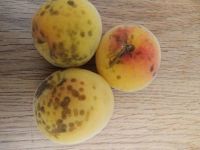 南高梅の黒い点は黒星病という病気で、見た目は悪いですが食べても害はありません。 農薬散布したものが残っているだけのように見えますが・・・