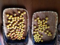白いのは残念ながらカビ?のように私は思います。 茶色い点々は仕方ないかと。 割りとそんなもんです。 今日スーパーで見たものはもっと点々でしたし、粒ちっさ!でした。 昔、コストコではないですが無農薬の買った時は点々だらけでした。 当たったような茶色い染みは、はじくか悩みます。程度によります。 塩漬けすると、茶色い染みが強く広がってくるようなもの(腐敗してます)はすぐはじきます。 数年前ですが、一箱に10粒位ははじいたものあったと思います。 今年はまだの為、以前の情報になりますが。