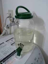 私は横置きしないので、液漏れの憂き目には会っていないのですが、そのかわり置場所から洗濯機に運んで直接投入口に注ぐという横着をしているもので、この容器が重くて重くて、、 で、小分けに出来る容器を探していたのですが、昨日ダイソーさんで写真のようなポリ容器(コック付3.8L)を見つけて、税別300円でしたが購入してみました。 試しに6分目まで入れて様子見です。 このくらいなら取り回ししやすい♪ しばらく使ってみてまたご報告したいと思います。