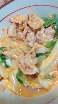 新たまねぎを追加 あんじょうねぎも追加 自分の分だけ取り分けて、たまごを割りいれてレンチン まだ辛いかな…orz